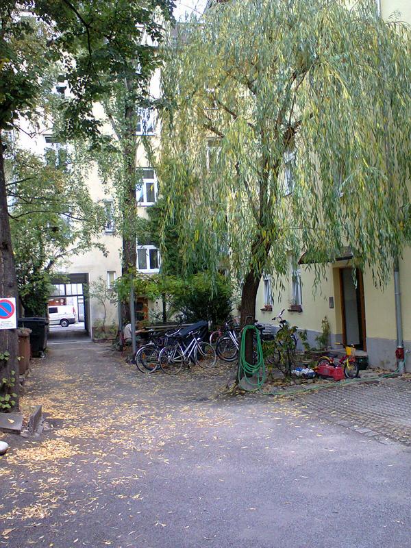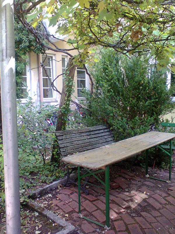 Frei gewordene KfZ-Stellplätze wurden nicht wieder vermietet, so dass schließlich vor dem Seitengebäude eine ansehnliche Sitz- und Pflanzfläche entstand. Ein Mieter brachte aus Norditalien zwei klimarobuste Weinstöcke mit, die seither den Sitzbereich natürlich überdachen.